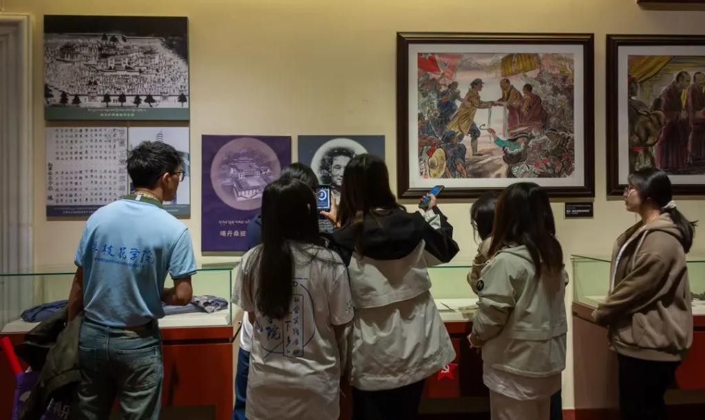 木棉传语推普小队前往乡城县红军纪念馆开展参观学习活动,重温红色历史,感悟军民情谊。在纪念馆内,小队成员们重点参观了展现乡城人民迎接与欢送中国工农红军第六军团的场景图,直观感受了当年红军过境时军民互动的温暖画面。同时,大家还近距离观摩了红军使用过的马鞍、军装、绑腿等生活用品,以及枪、大炮等武器装备,还有书具、时报等历史文献,这些实物与史料生动还原了红军当年的生活与战斗风貌。
