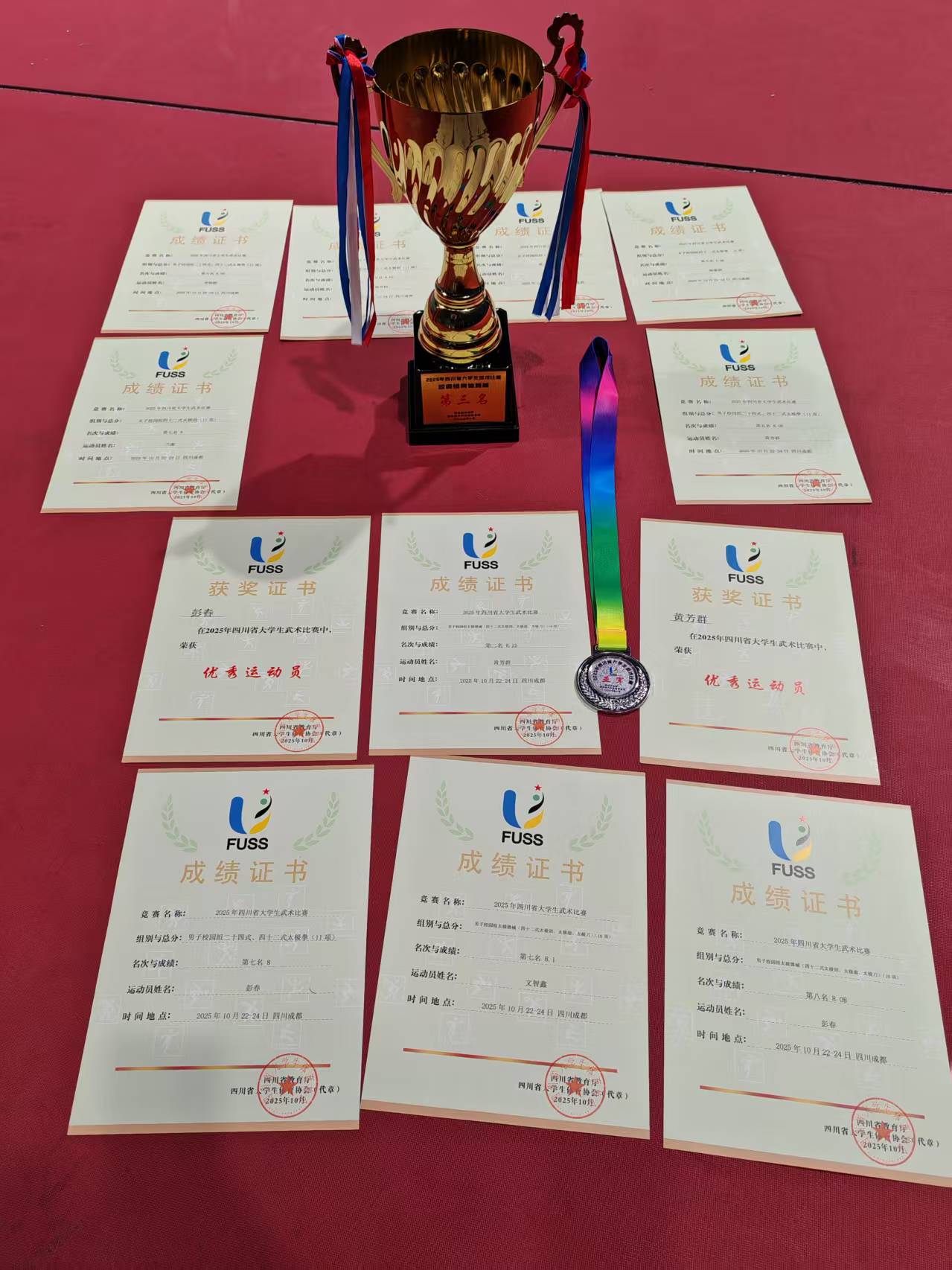 10月23-24日,由四川省教育厅主办、四川省大学生体育协会执行、成都理工大学承办的2025年四川省大学生武术比赛在成都城东体育公园成功举行,来自55所高校的419名运动员在拳术、器械、对练及集体项目角逐中展现当代大学生的扎实的武术技艺与朝气蓬勃的精神风貌。我院武术代表队在彭启录、罗秀英老师的带领下在2025年四川省大学生武术比赛中再创辉煌!共斩获个人奖项9项、集体奖项1项。