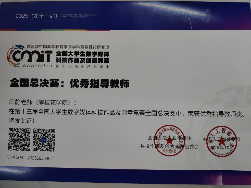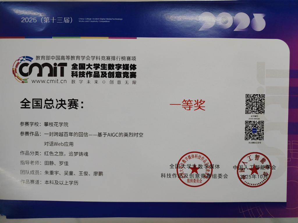 我院参赛团队(团队成员:朱重宇、吴童、王俊、廖鹏;指导教师:田静、罗佳)凭借作品《一封跨越百年的回信——基于AIGC的英烈时空对话Web应用》一路披荆斩棘,从数万件作品中脱颖而出,闯入全国总决赛。并于2025年10月25日在哈尔滨香坊永泰喜来登酒店总决赛现场的巅峰对决中,团队沉着应战,征服了评委,一举斩获全国总决赛一等奖;指导教师田静获得”优秀指导教师“荣誉称号!