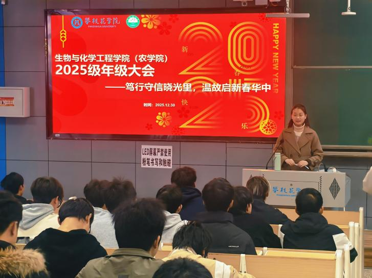 为强化学生思想引领、筑牢安全防线、总结学年成果,12月30日,我院2025级期末年级大会于志学楼1-116以“笃行守信晓光里,温故启新春华中”为主题顺利举行,大会由2025级辅导员苏炼老师主持,2025级全体新生参与本次会议。